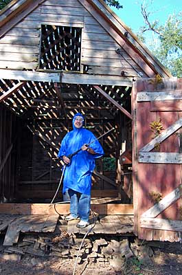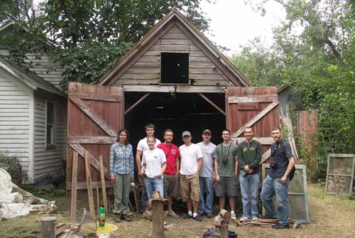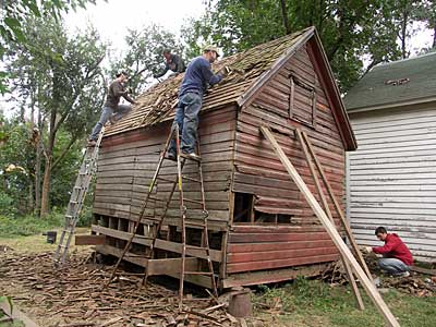 What do you do with an old farm shed? It’s the ideal farm building within the Jeffersonian ideal of the yeoman farmer, but in this age of corporate bottom-line-comes-first and heedless self-interest agriculturenot so. Restoring old sheds is pretty much in full decline as a social preoccupation, with all the glamour and appeal of having contact with third-world biohazards. But, flip the script, all you got to do is re-channel your inner Martha, adjust your attitude, and increase your appreciation of those treasures disguised as trash. With Panglossian effusion, the grad students in the UNL FACT class, free of obstacles to innovation, are transforming this palace of retro into a castle of class. Watch them during Art Harvest disassemble the shed and load the parts onto a trailer. Why all this activitywell, you can see the building, reassembled as a video viewing lounge, in the Sheldon Memorial Art Gallery as part of Art Farm@Sheldon, an exhibit opening in January 2008, showing the possibilities of what can be done with the rest of the old buildings at Art Farm.